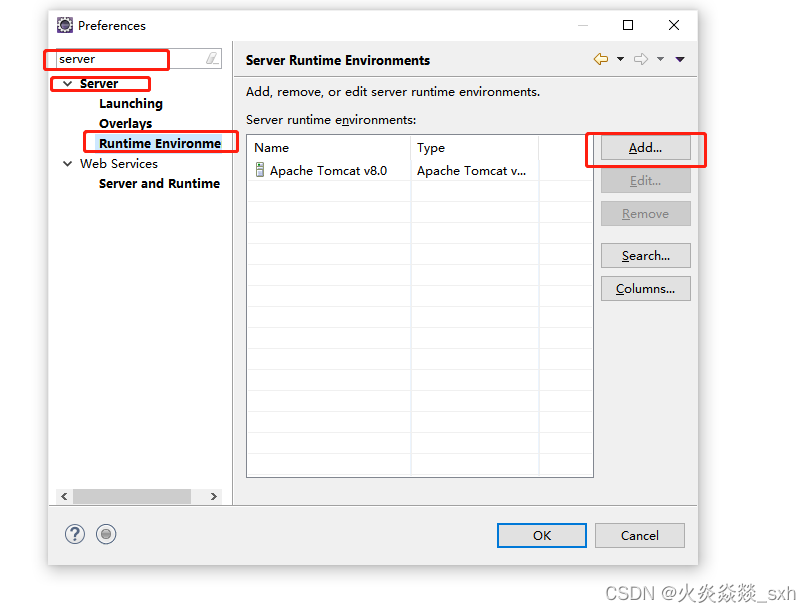 1.2搜索server,选择server下的Runtime Environme之后点击Add