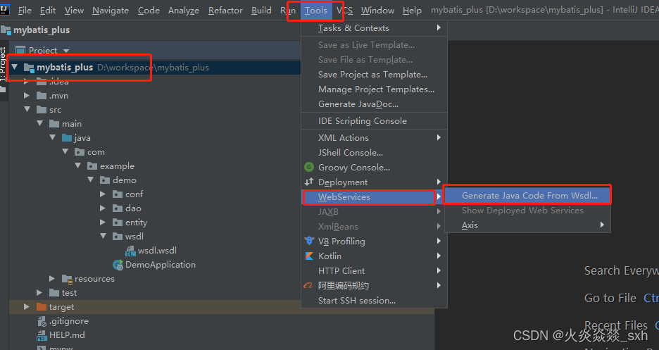 2.选中项目名,点击Tools,选中webservice,之后选中Generate Java Code From Wsdl