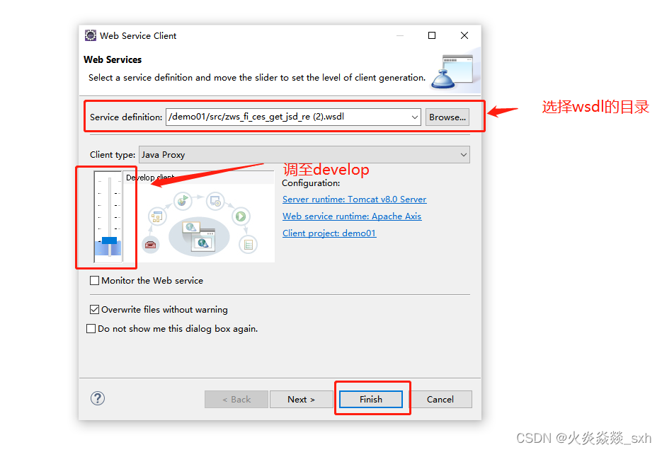 2.4选择wsdl的文件路径,调至develop,点击finish