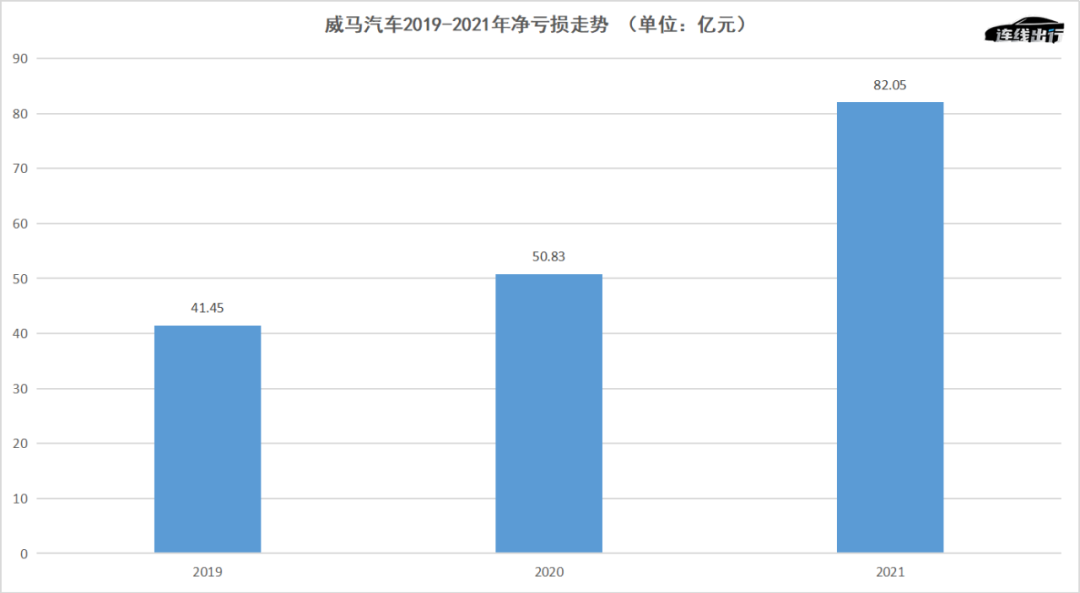 基于这样的单辆车亏损,威马总体的业绩也已陷入颓势之中。数据显示,2019年威马就已陷入亏损之中,当年录得净亏损为41.45亿元;2020年,这一亏损继续扩大至50.83亿元;再到去年,这一亏损甚至达到了82.05亿元,同比扩大了61.42%,三年亏损总额累计达到了174.33亿元。