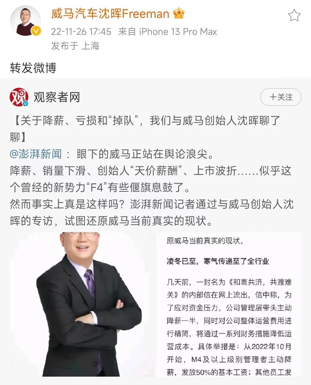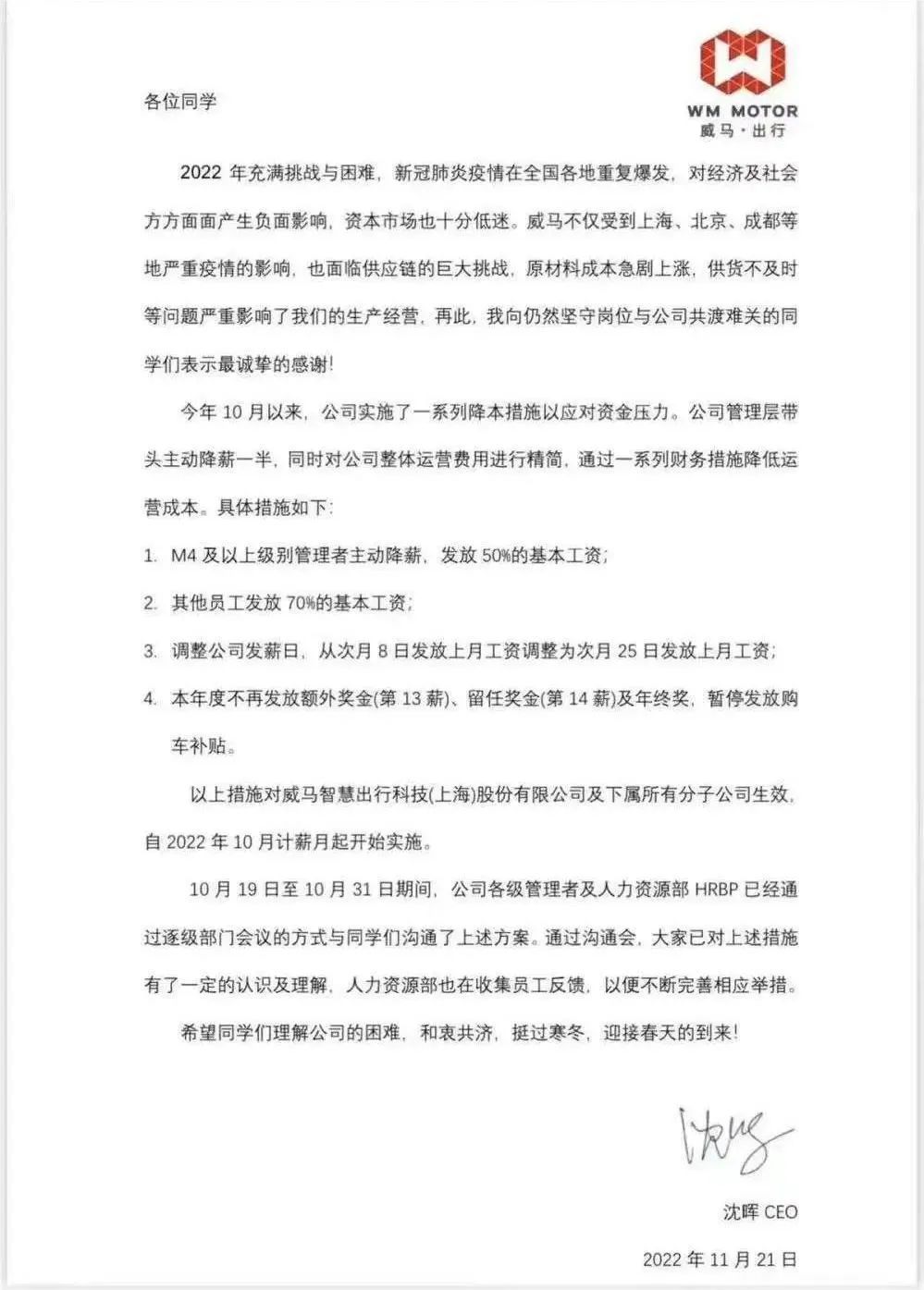 这些坏消息出现之前,威马汽车就已“命悬一线”。上月底,沈晖发布全员公开信,表示为了应对公司内部资金压力,会通过包括对高管和员工降薪、取消年终奖等降低成本的措施来缓解。