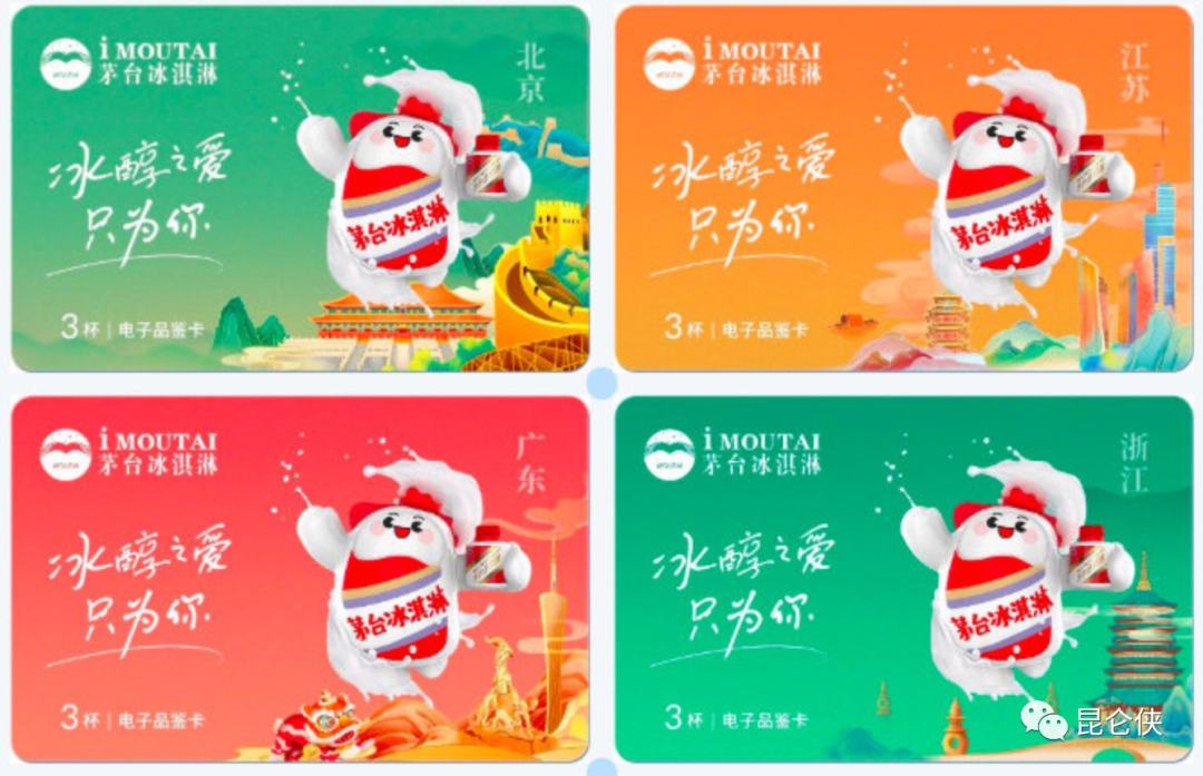 4、今年8月,中秋节前茅台推出冰淇淋品鉴卡,国庆节前又推出限量版的电子品鉴卡,可以直接转发给朋友,非常方便。这些卡都可以作为礼品卡来运营的,送长辈茅台酒,送年轻人冰淇淋卡。可以说茅台在送礼这件事上是非常专业的。