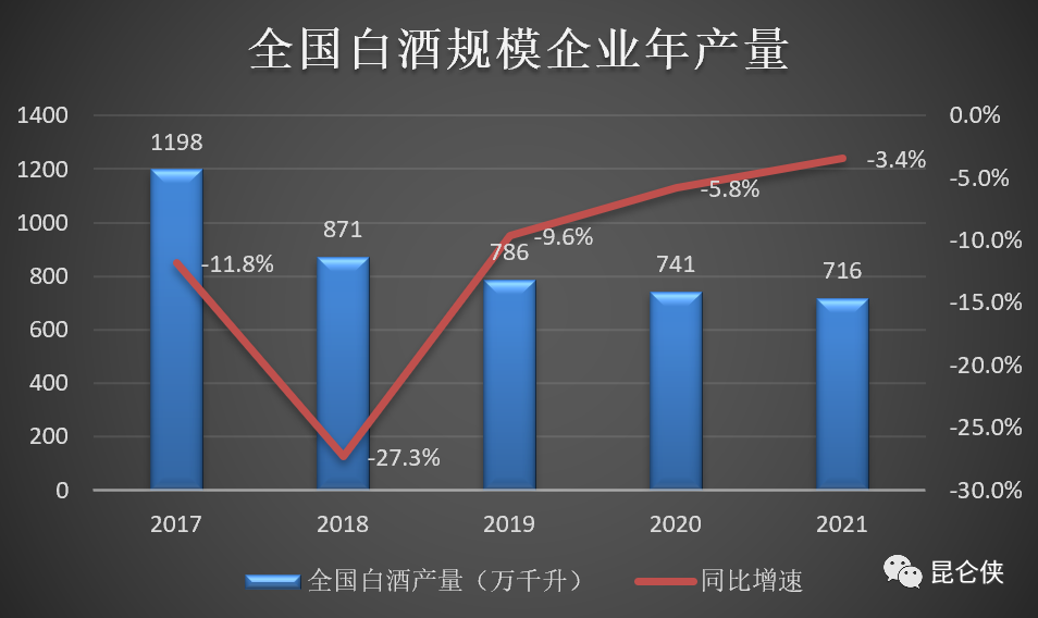 根据国家统计局数据,自2016年起中国白酒的产量便逐年下降,从2017年的1198万千升下降至2021年的715.6万千升,近乎“腰斩”,已经连续多年负增长,未来可能还会继续下降。