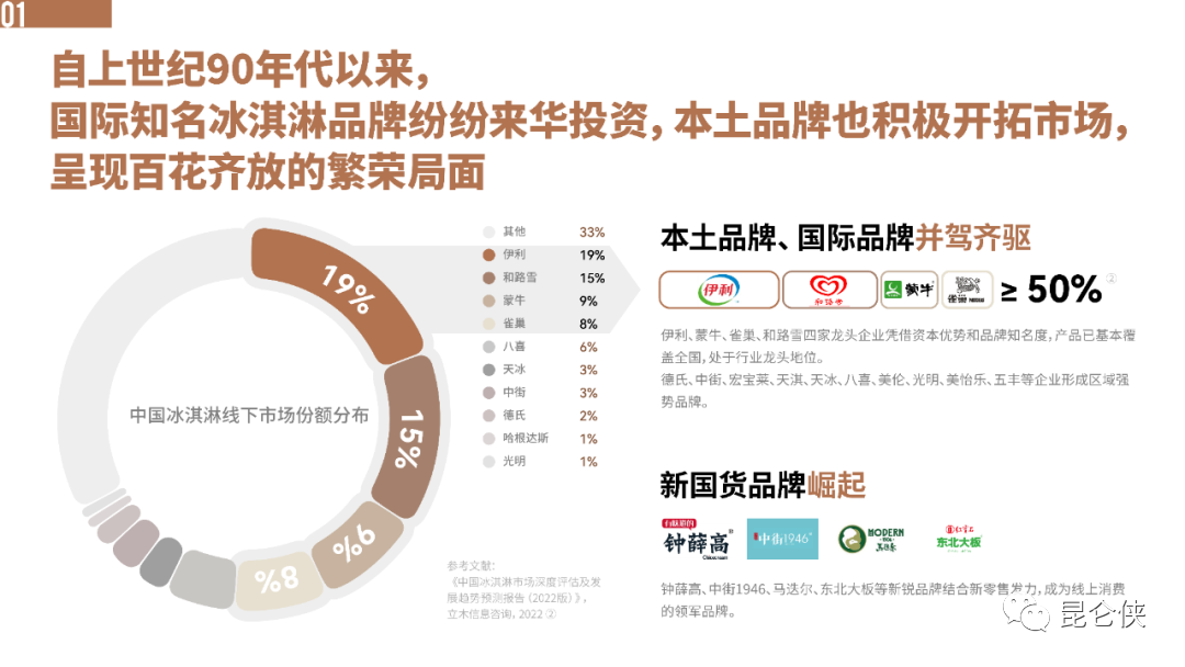 该报告显示,2021年零售总额份额排名前五的冰淇淋品牌依次为:伊利(16.0%)、梦龙(4.3%)、可爱多(4.3%)、蒙牛(3.7%)、五丰(2.4%)。而从线下市场份额来看,乳业巨头伊利和蒙牛以及国外品牌联合利华和路雪、雀巢占据领先地位。