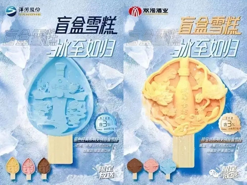 此外今年8月,白酒品牌洋河也是迅速跟进,推出3%酒精含量的文创雪糕产品,分别是“蓝海寻宝”海之蓝文创盲盒雪糕和“遇见珍宝”双沟圣坊文创盲盒雪糕。