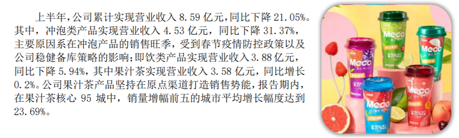 冲泡类产品的业绩下滑明显,是影响整体营收的关键因素。 据半年报解释,下滑的主要原因“系在冲泡产品的销售旺季,受到春节疫情防控政策以及公司稳健备库策略的影响”。