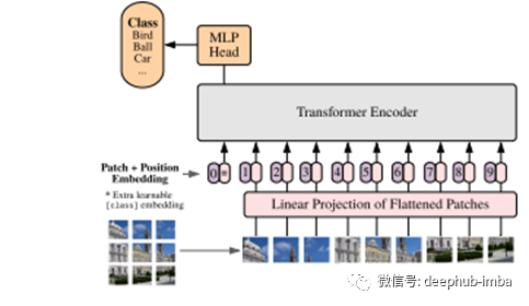 图像不是序列。但是可以将图像解释为一系列区块,然后通过Transformer编码器对其进行处理。只需将图像划分为小块,并提供这些小块的线性嵌入序列即可作为Transformer Encoder的输入。图像区块与NLP下游任务中的标记(单词)的处理方式相同。此方法可以用来替代当前广泛使用的基于CNN的图像处理管道中的特征提取方法。视觉处理的Transformer基于此概念。
