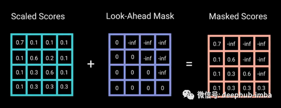 一旦我们计算出序列中所有单词的缩放分数,我们就应用“向前看”遮罩来获得遮罩分数。