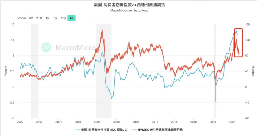 在很长周期内,美国通胀乃是成本端上涨引起,石油又是其中最关键因素。石油价格上涨,全社会消费成本飙升,进而推高物价水平。