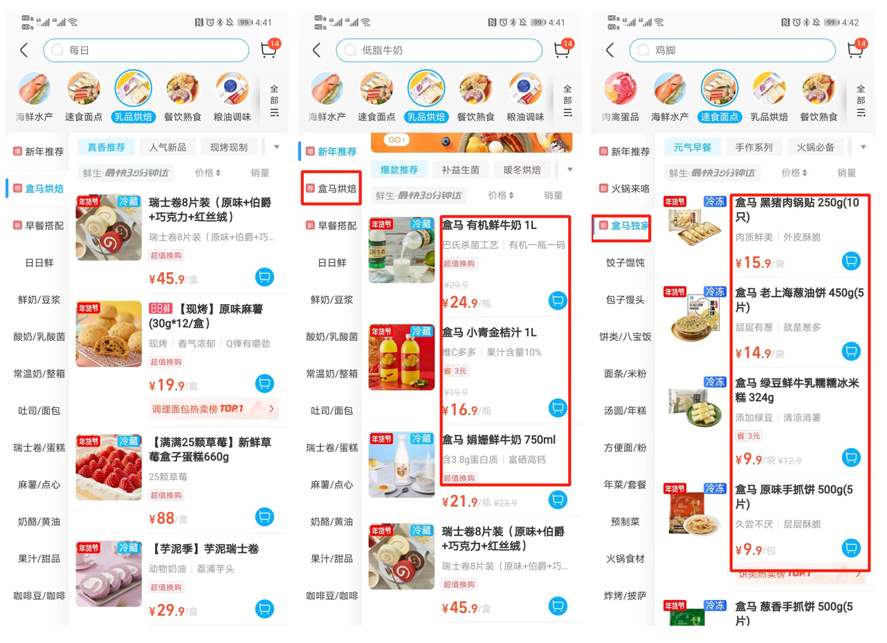 打开盒马APP就能发现,在乳品、烘焙、冷冻速食食品等品类上,盒马自有品牌商品都出现在了显眼位置,SKU数量不低,且大部分商品都获得系统的流量倾斜,销量也是名列前茅。尤其是盒马烘焙工坊的出品,人气逐渐赶上山姆等竞争对手。