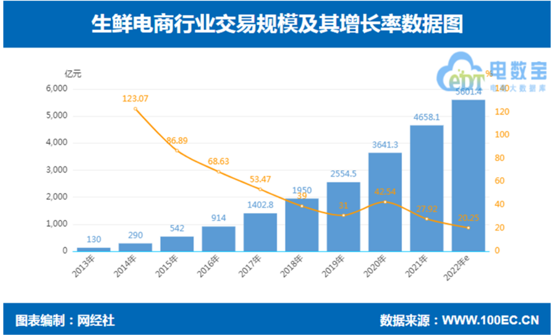 网经社电数宝电商大数据的统计显示,2022年生鲜电商交易规模约为5601.4亿元,同比增长20.25%,是近十年来最低增幅。受市场大环境影响,生鲜电商的投融资市场也在去年大幅降温。统计显示,去年上半年国内生鲜电商行业公开披露的融资事件只有两起,投融资总额仅有2亿元。
