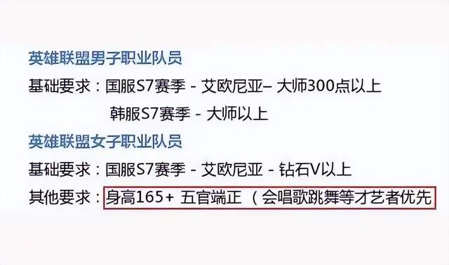 网友爆出的某战队招聘信息显示,《英雄联盟》女子职业队员的招聘要求中,除了常规的游戏分段要求,还多了身材、形象、以及唱歌跳舞的才艺要求。