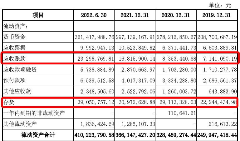 招股书显示,报告期内,公司应收账款逐步上升,2019年至2022年上半年分别为714.11万元、835.34万元、1681.59万元、2329.88万元。与此同时,公司应收账款周转率呈现下降趋势。报告期各期末,公司应收账款周转率为35.65次、33.63次、26.44次、19.52次。报告期各期末,存货分别为2224.44万元、2911.3万元、3097.26万元和 3905.08万元,呈现逐年上涨趋势。