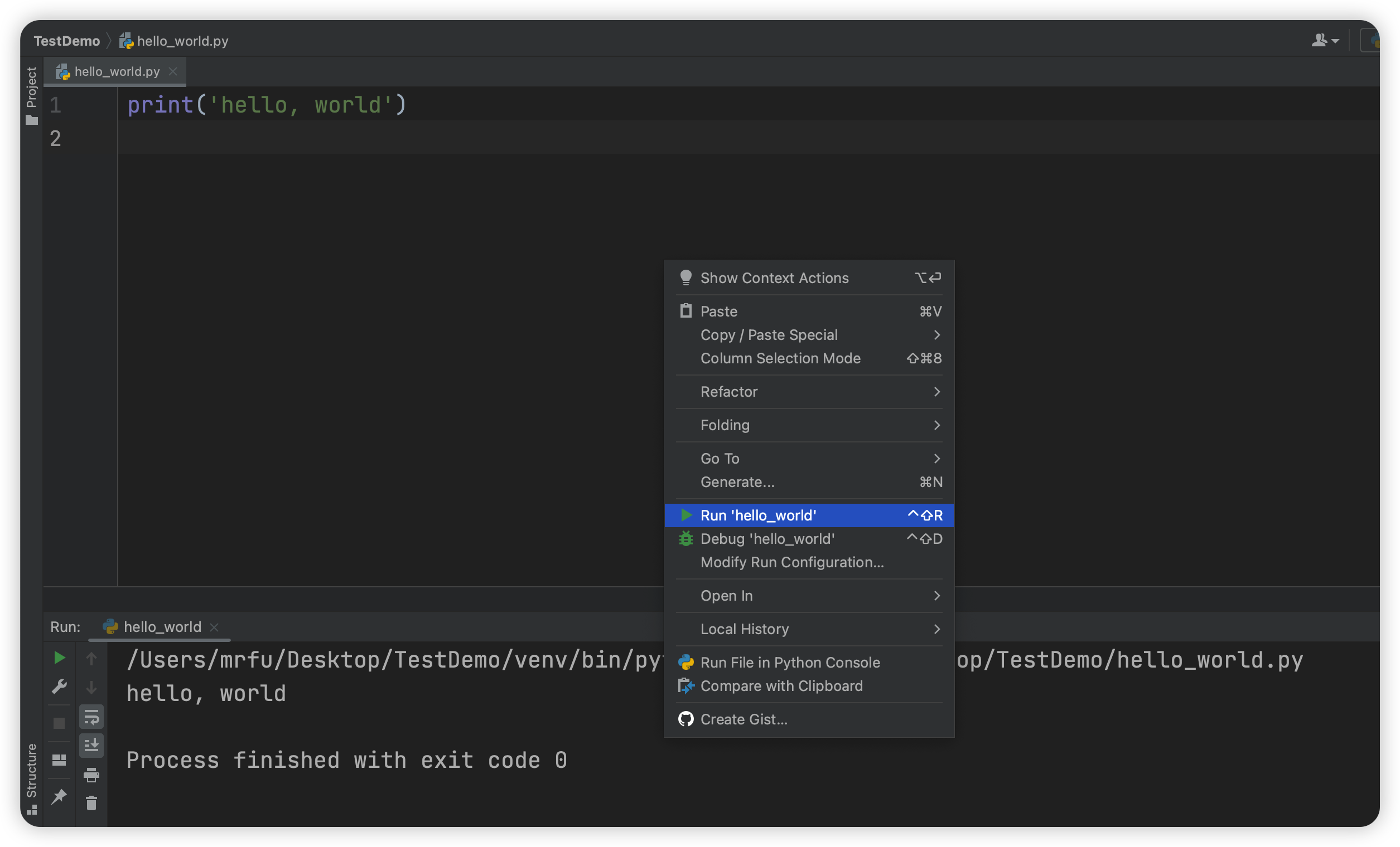截止到此时,一个Python项目在PyCharm中就创建完成了,那么如何进行代码的书写呢?