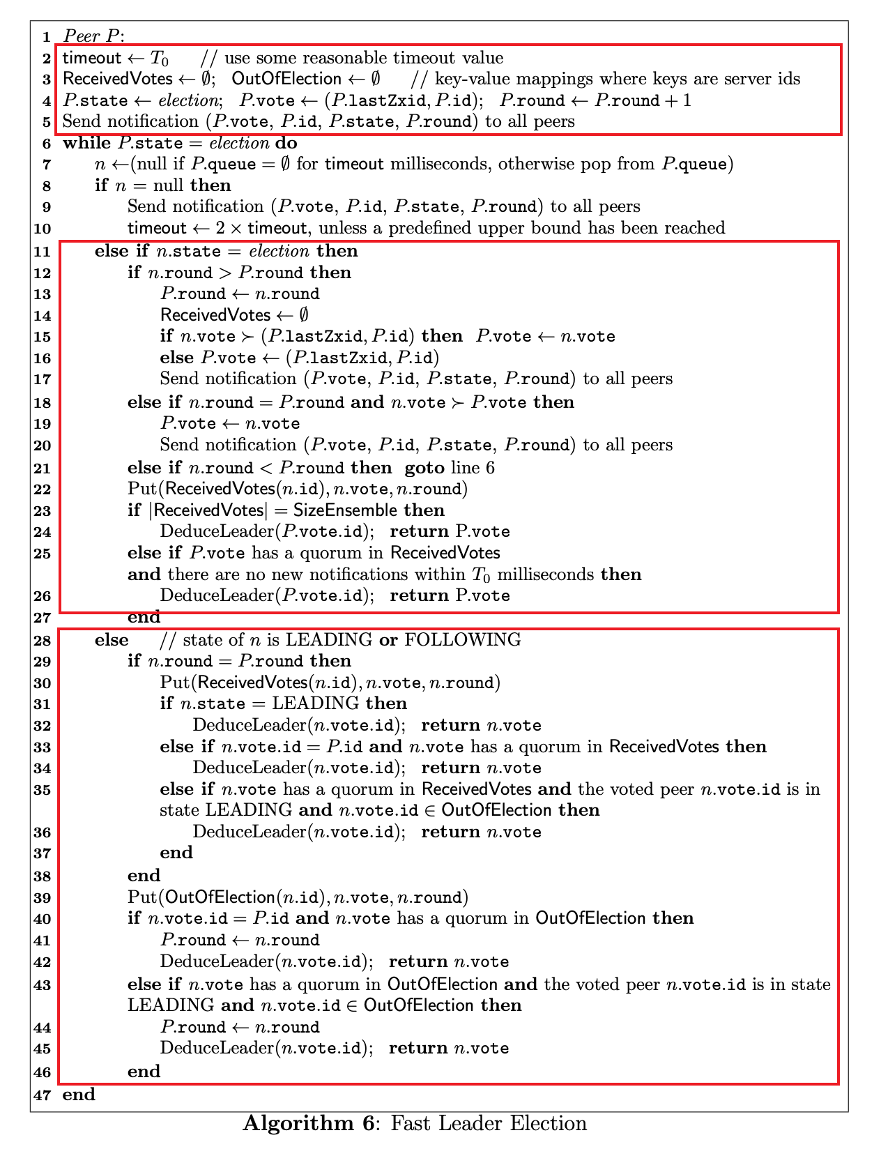 这个阶段的目的是选出一个 Leader,然后进入后续阶段。具体的算法将会在后续 ZK 的实现小节中阐述,也就是 FLE(Fast Leader Election)算法。