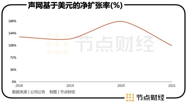 还有一个数据可以说明客户增长情况。声网在财报中采用了“基于美元的净扩张率”指标。根据声网在招股说明书中的解释,这个数据的含义是当客户增加对产品的使用、将产品的使用扩展到新的应用程序或采用新产品时,基于美元的净扩张率就会增加,反之亦然。