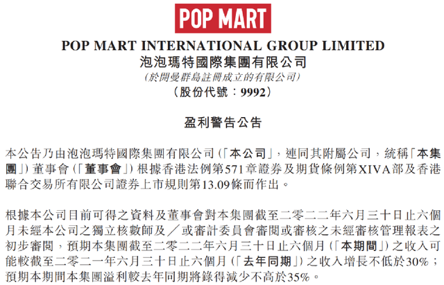 但1年半后的2022年7月19日,泡泡玛特股价收盘时已跌至22.25港元/股,市值降至仅有巅峰时期的两成。而就在此前的15日和17日,泡泡玛特分别发布《盈利警告公告》和举行业绩交流会,将自身业绩不佳利润下滑,归咎于疫情的影响。