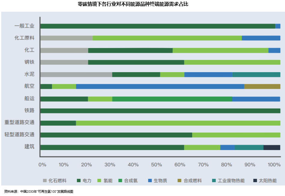 我们可以参考中国氢能联盟研究院的数据。上图是在零碳状态下,各个行业终极的能源来源。在化工原料、化工、钢铁、重型交通运输等行业,氢能都是绝对的第一主力。即使在那些电力绝对主导的行业,氢能可能也是其电力的重要来源。