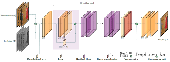 - 在一个卷积层之后,使用32个相同的残差块(ResNet),每个残差块由两个卷积层组成,中间有一个ReLU层。
