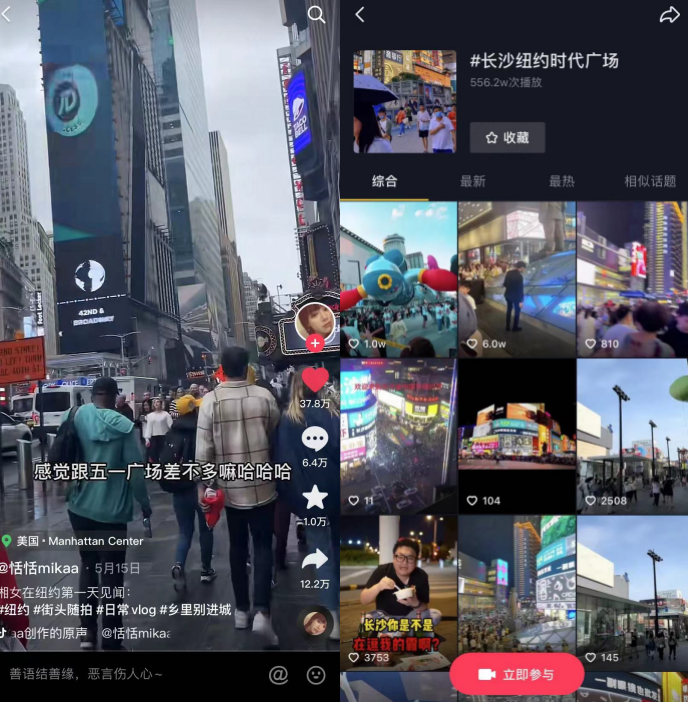 更具代表性的例子是一则名为《湘女在纽约第一天见闻》的抖音视频,通过点出纽约时代广场与长沙五一广场的共性,变相提升了长沙的城市影响力。#长沙纽约时代广场#的抖音话题下,既有长沙本地人,也有慕名而来的外地游客,话题播放量已超500w次。