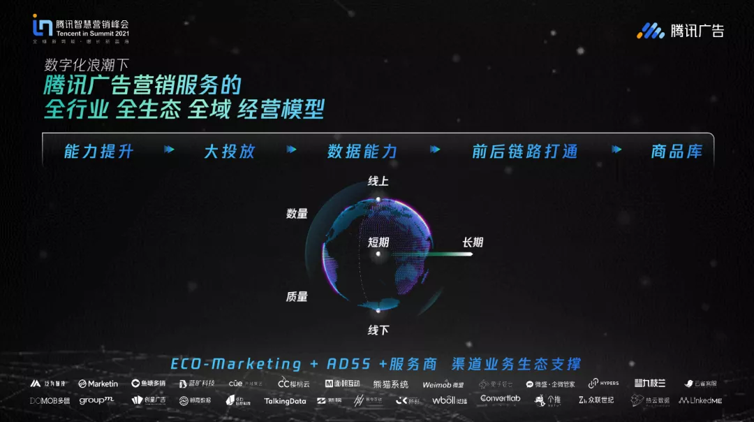 2021年腾讯智慧营销峰会上,腾讯广告明确平台定位是“企业全域经营伙伴”,并提出三个优势,简单总结就是:公私域联动,线上线下链接,以及跳出营销范畴做生意。