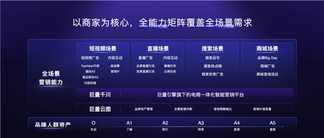 这相当于,短视频、直播等内容流是用户潜在兴趣的激发转化场,用户在这里深度种草,高效成交;商城、搜索等主动探索场景是用户已有兴趣的承接转化场,用户在这里找到了固定路径,形成习惯,实现精准匹配和复购。用户的各类电商行为沉淀在店铺里。营销解决方案扩大至全域流量,实现全局加速。