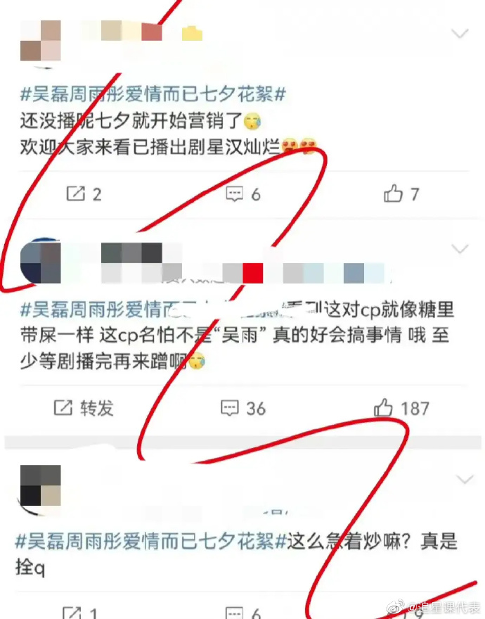 微博营业不走心的窦骁被称“赘婿”;吴磊新剧《爱情而已》发七夕物料、与另一小花的恋情传闻,都惹“吴露可逃”CP粉不满;王鹤棣在有圈外女友的情况下仍与虞书欣在花絮或综艺中甜蜜互动,被指“诈骗”。