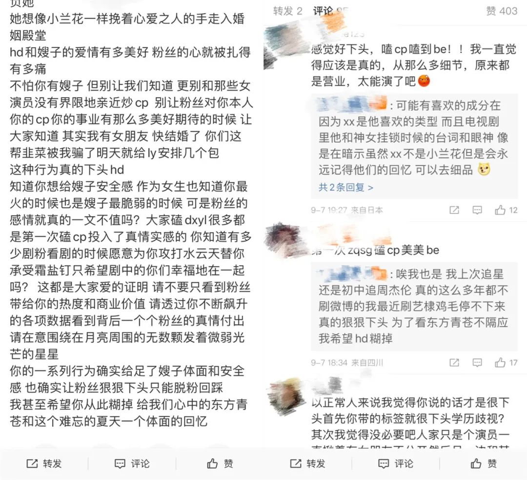在耽改生态中,这些矛盾曾被极端呈现。如今虽然耽改殉了,但CP内卷并没有停。沿用着耽改时期的思维定式与消费习惯,年轻人在BG CP上的情感与实际投入越来越重,对演员戏外营业的要求也越来越细、越来越高,一不遂心就回踩的情况时有发生: