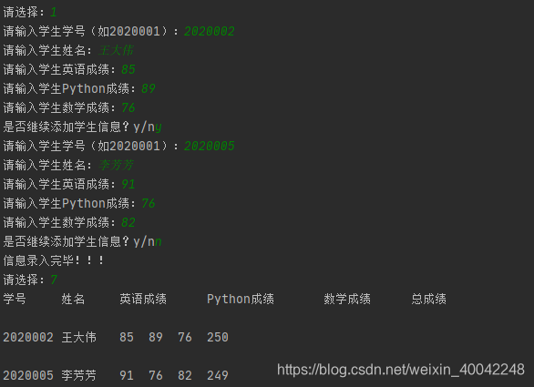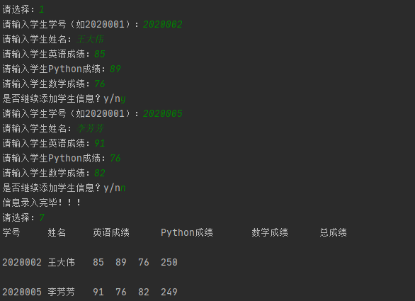 # 录入学生的信息包括学号、姓名、英语成绩、python成绩、数学成绩、总成绩