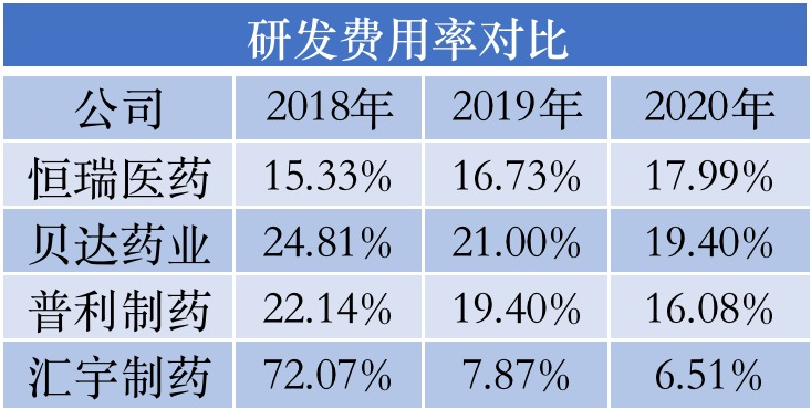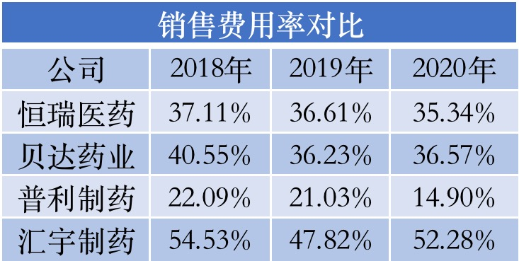 如是所言,对比同行,2018年-2020年,恒瑞医药(600276.SH)的销售费用率分别为37.11%、36.61%、35.34%,贝达药业(300558.SZ)为40.55%、36.23%、36.57%,普利制药(300630.SZ)为22.09%、21.03%、14.90%。