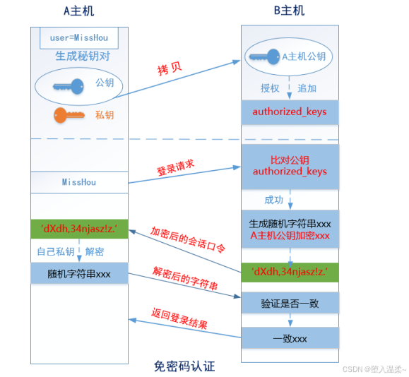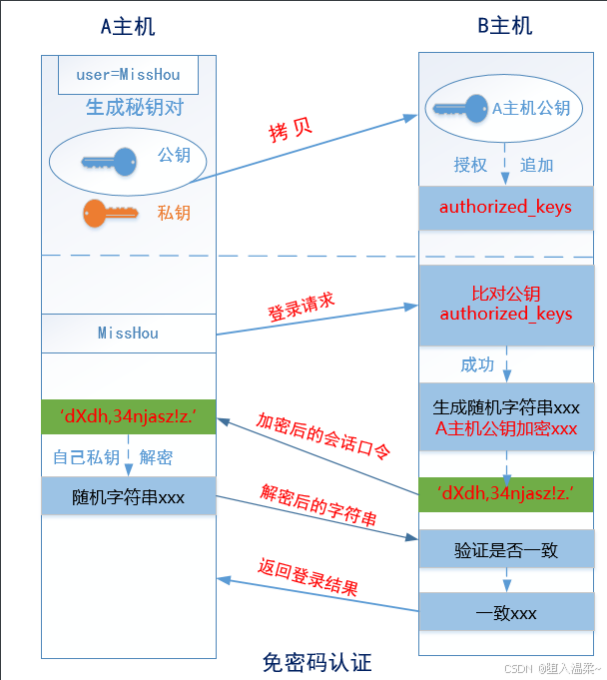 基于密钥对认证,也就是所谓的免密码登录,理解免密码登陆原理: