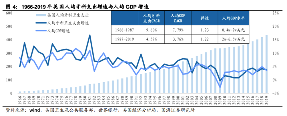 以美国为例,1966~1987年,美国人均GDP由4000美元增长至20000美元,而口腔医疗市场在这个过程中经历了高速增长,人均牙科支出从15.2美元增长到104.5美元,年均复合增长率为9.6%。