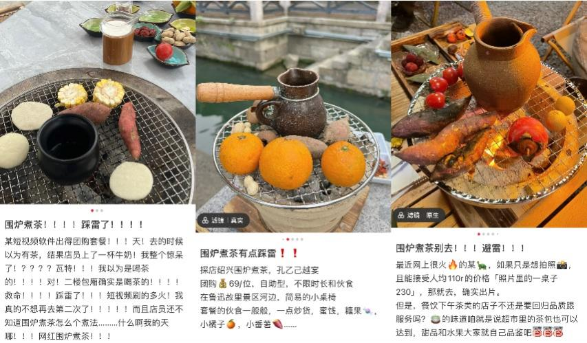 在体验围炉煮茶的两个小时里,贺君汐吃到了苦到难以下咽的烤橘子,她的朋友吃到了受潮的花生、糊掉的年糕以及发涩的柿子。最后她们一行人总结:拍个照发条朋友圈就可以了,体验的过程是真没什么美好的。