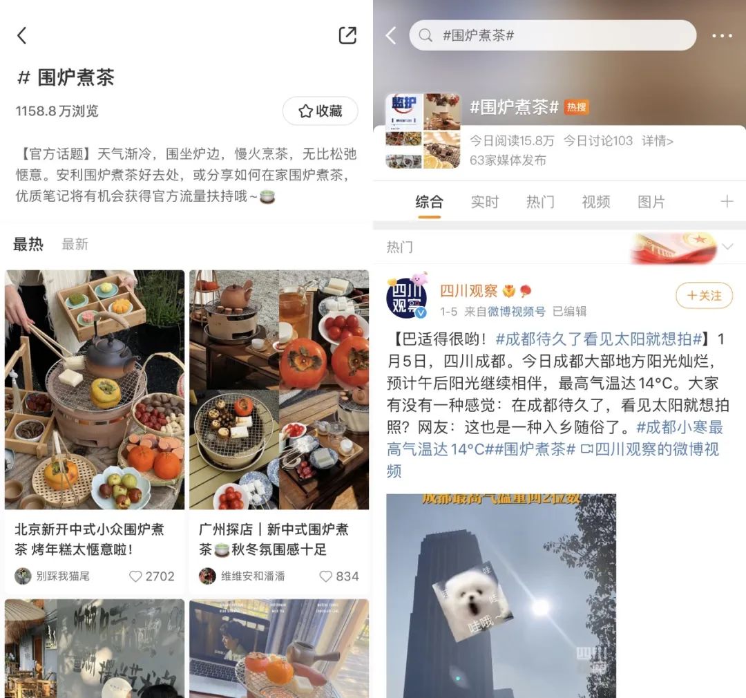 截至目前,锌刻度发现“围炉煮茶”在小红书上的浏览量达到了1158.8万,相关笔记超过19万篇,相关商品超过1万件。“围炉煮茶”在微博上也产生了诸多话题,其中“冬日围炉煮茶有多香”“这届年轻人是懂围炉煮茶的”“冬天的快乐是围炉煮茶给的”等话题阅读量颇高。
