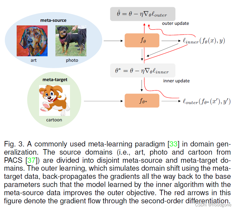 - 多数基于DG的元学习方法都遵循该范式:将源域划分为不重叠的元源域和元目标域,模拟域偏移。学习的目标是使用元源域更新模型,从而减少元目标域上的测试误差,通常通过两级优化来实现。