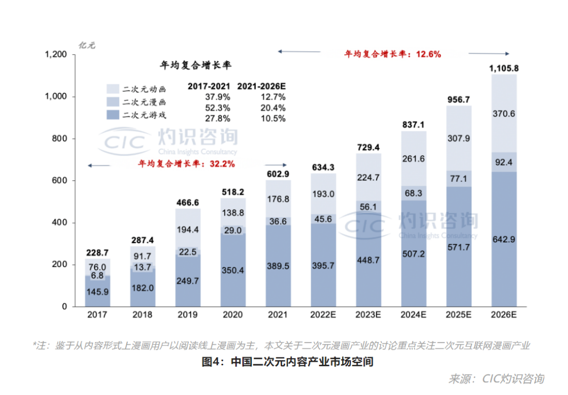 “CIC灼识咨询”数据统计,我国泛二次元用户基础广泛,2021年时已经达到近4.6亿人,基于此,2021年中国二次元内容市场约602.9亿元,预计到2026年中国二次元内容市场有望达1105.8亿元,未来五年中国二次元内容市场规模年均复合增长率约12.6%。