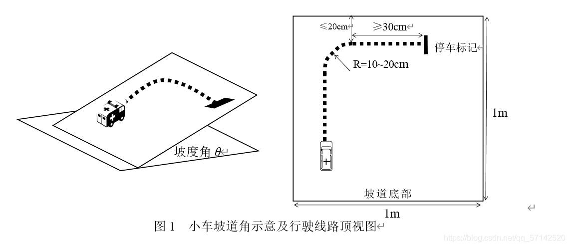 利用TI的MSP430/MSP432平台,设计制作一个四轮电动小车。要求小车能沿着指定路线在坡道上自动循迹骑线行驶。小车必须独立运行,车外不能使用任何设备(包括电源)。小车(含电池)重量小于1.5kg,外形尺寸在地面投影不大于25cm×25cm。坡道用长、宽约1m的细木工板制作,允许板上有木质本色及自然木纹。木工板表面铺设画有1cm×1cm黑白间隔的纸条(以下简称为标记线)作为路线指示;标记线起始段为直线,平行于木板两边;标记线在坡顶转向90°,转弯半径20cm;标记线平行坡顶距离≥30cm,距坡顶距离≤20cm;标记线总长度为1m。停车标记为宽1cm长5cm的黑色线条,垂直于坡顶标记线。小车坡度角示意及行驶线路顶视图如图1所示。