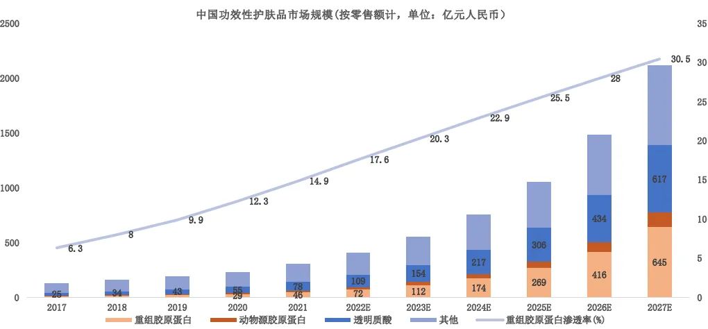 当基因重组技术获得突破后,成本降低使得规模化生产变成现实。2018年开始,重组胶原蛋白的市场规模开始逐渐超越动物源胶原蛋白。根据巨子生物招股书中沙利文咨询披露的数据,预计到2027年,重组胶原蛋白的市场规模将达到645亿元人民币,**5年间复合增长率达到惊人的79.2%**。届时重组胶原蛋白将超越透明质酸成为功效性护肤市场使用量最大的成分。
