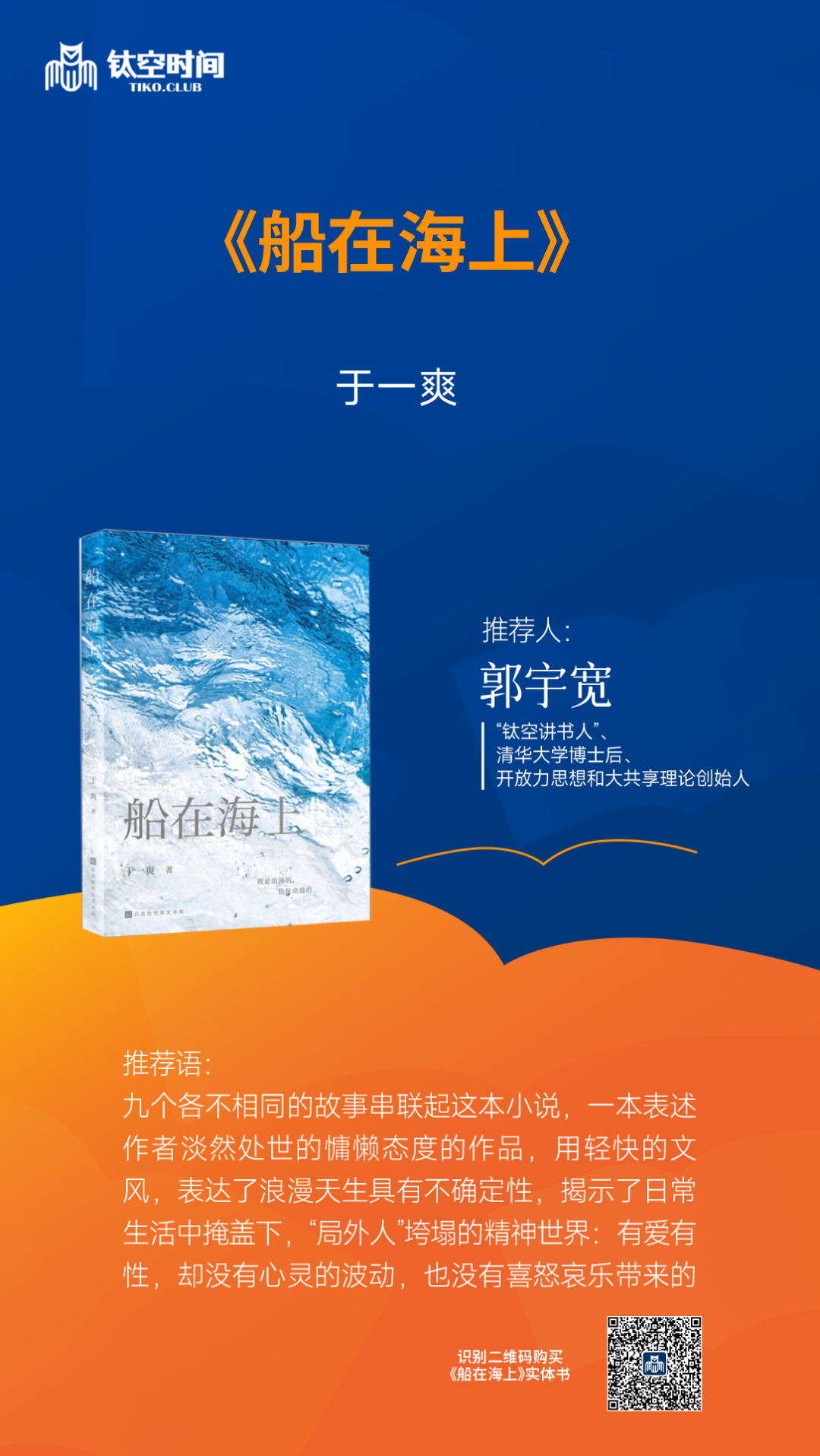 于一爽:我反而觉得这个倒是一个挺好的状态,更没有什么价值观的输出,但是说没有价值观的输出其实也并不全面,比如说《船在海上》这本书,当时为什么叫这个名字?这是一个短篇小说集,是我觉得船在海上的状态其实就是相当于人在很多情境中的状态,就是你在一条船上,你不知道这边的岸在哪,因为你已经离开了这边的岸,你也不知道对面的岸在哪?马上就到或者很久以后才到,然后船也可能很平静,也可能不平静,无依无靠,然后同时你又跟所有东西都没有关系,这个状态然后也很动荡,我觉得这也是当代人的状态,因为当代人的状态我觉得太综合了,也是我小说中很多人物和人物关系的一个出发点。** **