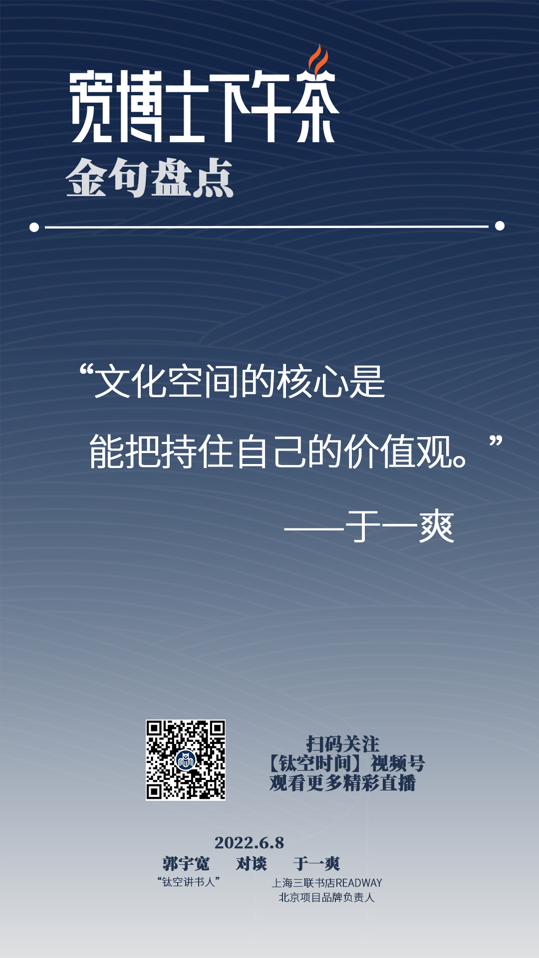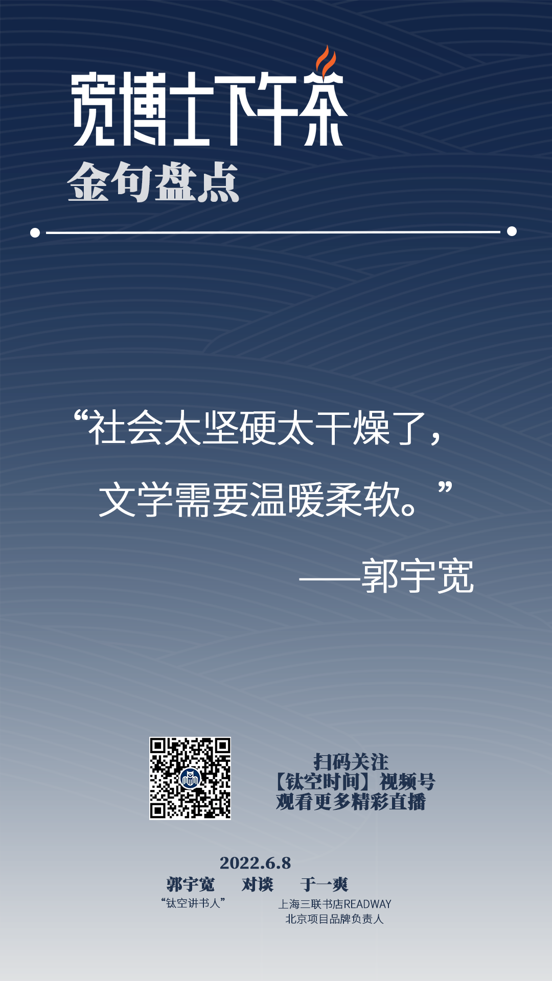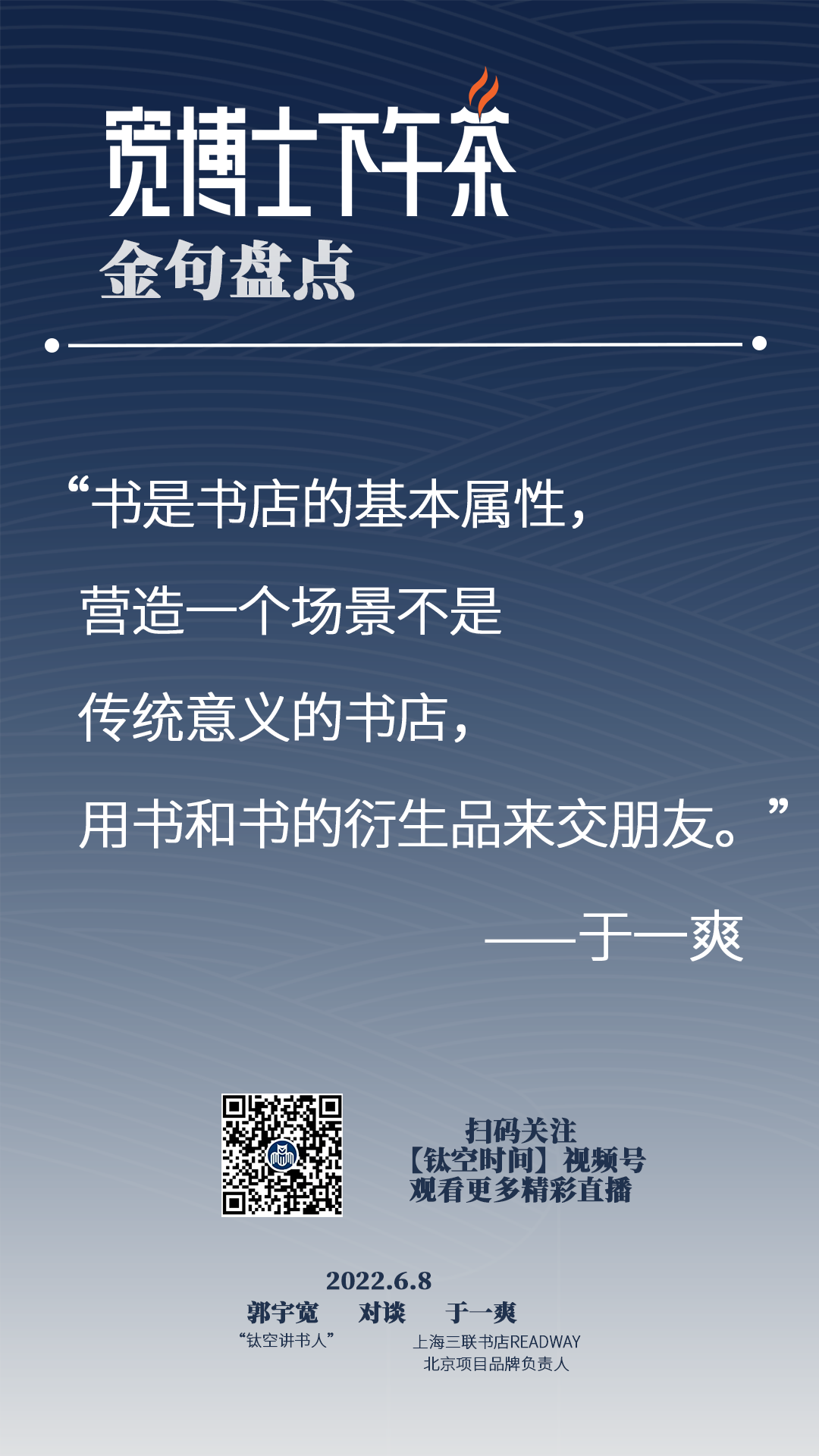 宽博士:****对,像您讲到这个人的需求,讲到这个交朋友,我觉得讲到一个很重要的关键词就是人的需求,所以如果说现在社交媒体能够这么火,那社交到底拿什么来社交呢?这个于老师讲的对我是一个很好的启发和补充,其实您的那个书店本质上,办的就是一个对于在一个城市场景下生存的人的一个社交空间,书店的经营,其实今天我们的讨论已经延伸开来了,就是我们看上去经营的是一个书店,其实你经营书店背后想经营的本质是什么呢?可能也是一个空间,也是一个场景,也是一个社交圈。