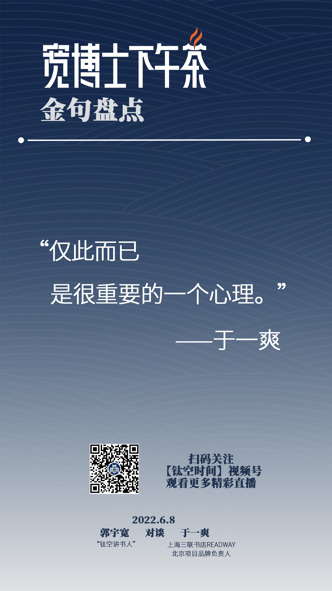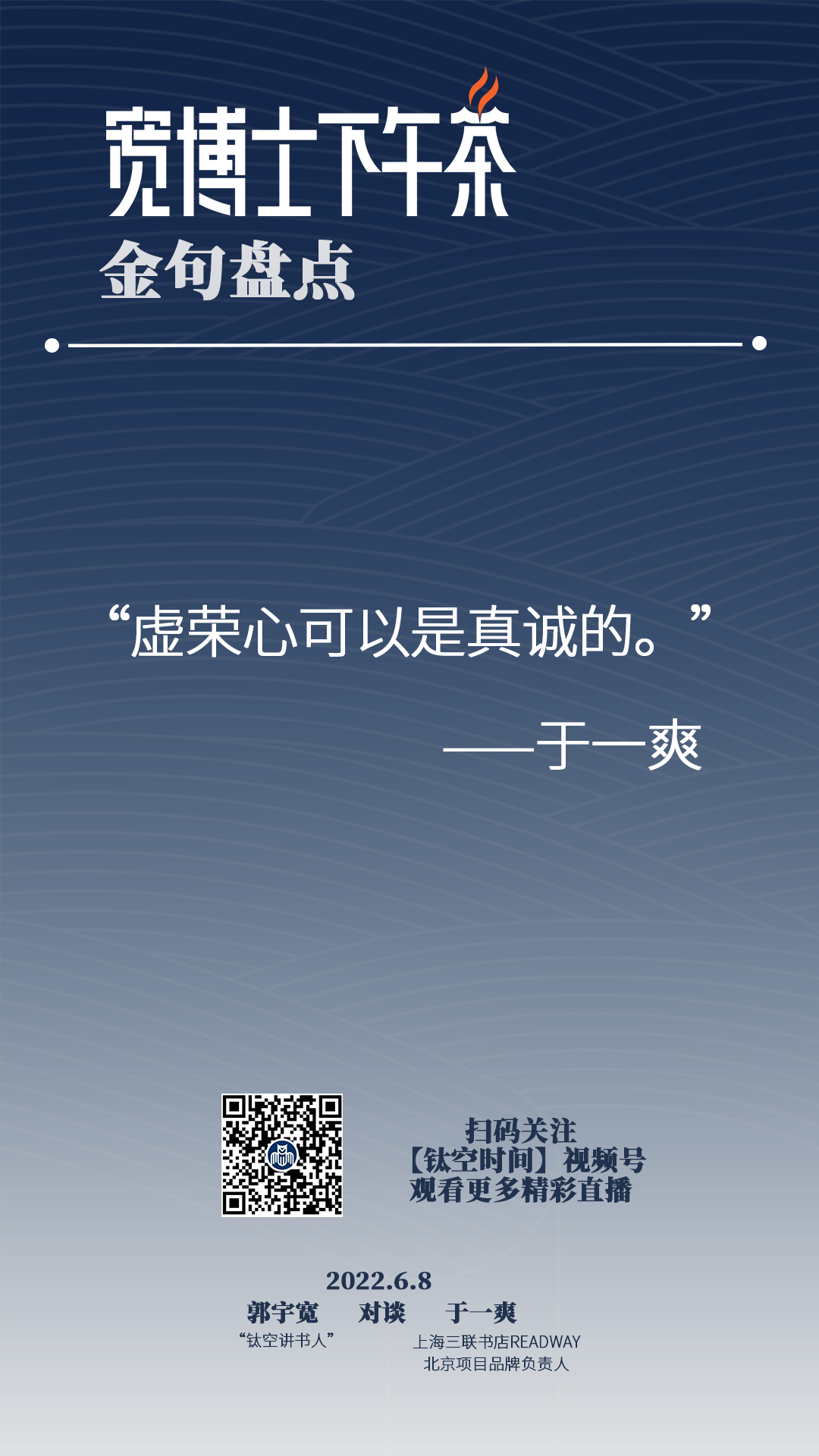 于一爽:****对,我觉得就不用过分夸大时代之间的不同,也许是一种螺旋上升,总之我觉得人在很深的地方是相通的,那我觉得读书是一种成本最低的方式,然后相对抵达比较深的地方,然后让大家链接,或者说白了,就是为什么读书你就是一种其实挺廉价的,然后你又有愉悦感的事情,那为什么不呢?