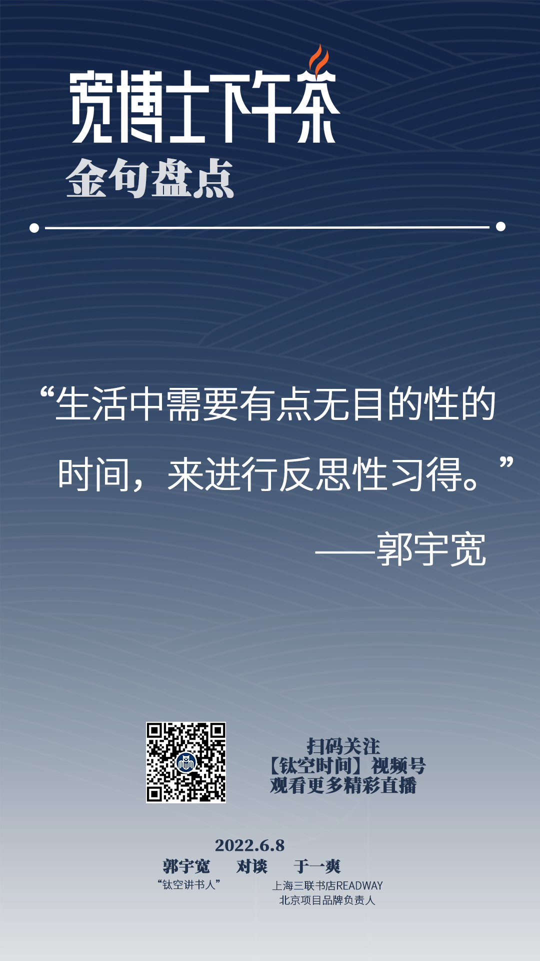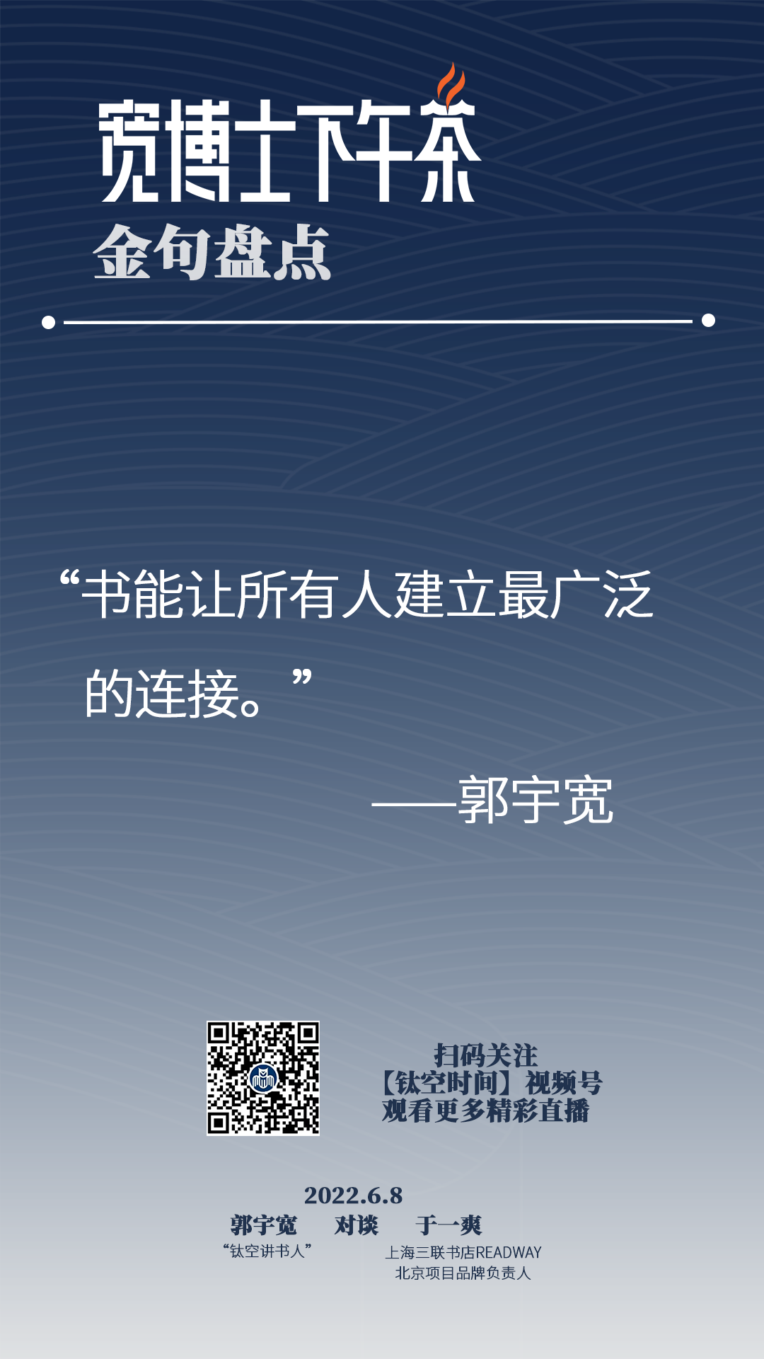 宽博士:**“生活、读书、新知”,我觉得现在想想好像真的没有什么词,比这三个简短的词概括得这么到位,你说我们是这个卖书还是劝大家读书对吧,这只是其中的一部分,如果我们尝试到我们是以书为载体带给大家的,推荐的是一种生活方式,一种打开你的视野的一种新知的更广阔的舞台,同时读书又是一个有效的方式。 **