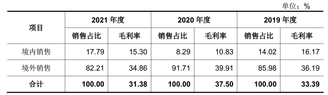 首航新能的境内和境外渠道有着截然不同的毛利率水平。2019年-2021年,其境内渠道的毛利率分别为16.17%、10.83%以及15.30%;反观境外渠道的毛利率分别为36.19%、39.91%、以及34.86%,后者甚至可以达到前者的三、四倍。
