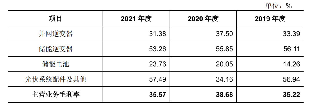《招股书》显示,2019年-2021年,首航新能并网逆变器业务的营收占比分别为91.19%、92.07%以及64.78%,毛利率分别为33.39%、37.50%以及31.38%。可以发现,首航新能并网逆变器业务稳定的毛利率表现,对公司整体的毛利率起到了“压舱石”的作用。