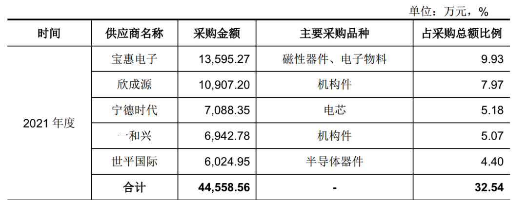 事实证明,宁德时代投资首航新能后,确实给后者带来了一定的资源。《招股书》显示,2021年,宁德时代突然出现在首航新能的前五大供应商中,主要采购品种为电芯,总采购金额为0.71亿元,占首航新能采购总额的5.18%。