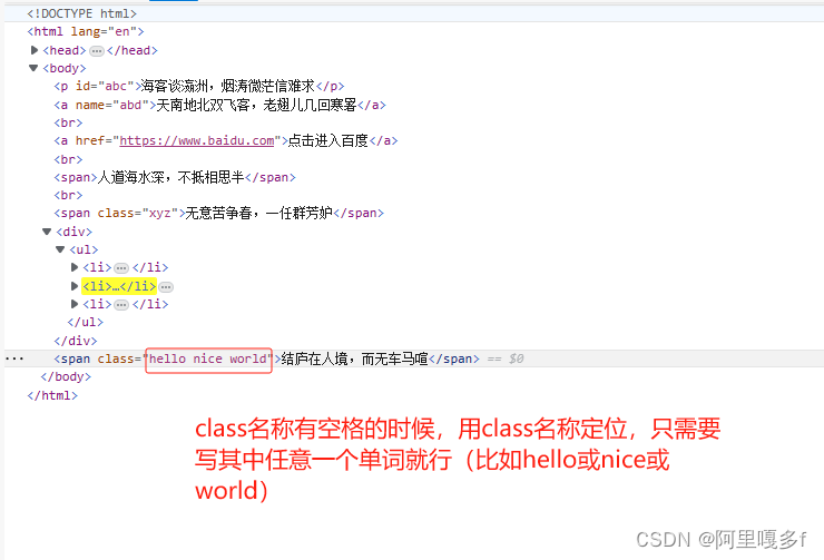 注意:如果class属性名称有空格,driver.find_element_by_class_name("hello nice world")这样定位就会报错