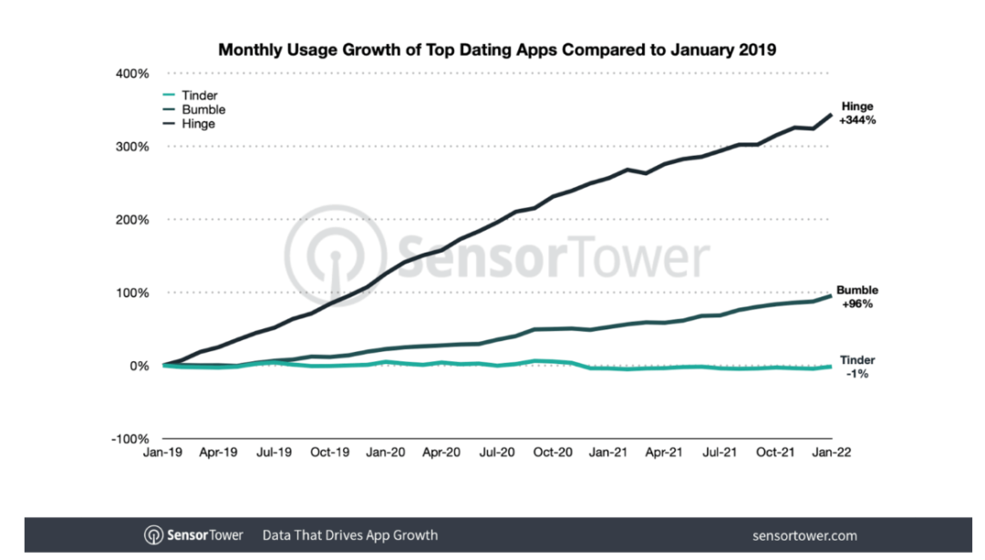 根据 Sensor Tower 的数据显示,在 2022 年 1 月,「Hinge」、「Bumble」的月活用户总数相比 2019 年 1 月分别增长了 344% 和 96%。相比之下,「Tinder」的用户增长则趋于稳定,其月活用户数量相比 2019 年同期甚至下降了 1%。虽然「Hinge」早已被 Match 收入麾下,但是“后浪”来势汹汹也不得不让「Tinder」有所忌惮。