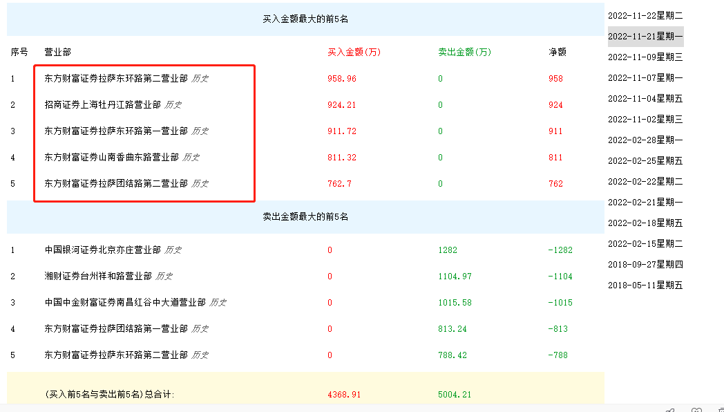 11月21日龙虎榜显示,买入金额前5名的营业部,著名游资拉萨军团占了4席,其中东方财富拉萨东环路第二证券营业部排名第一,买入金额958.96万元。随后在11月23日的龙虎榜里,东方财富证券拉萨东环路第二证券营业部、东方财富证券拉萨东环路第一证券营业部又分别卖出239.95万元、195.34万元。