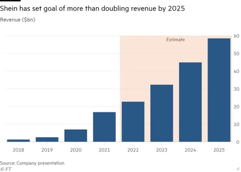 据前文所述文件透露,到2025年SHEIN的目标是实现营收585亿美元,这将超过零售巨头H&M和Zara现有年销售额的总和。
