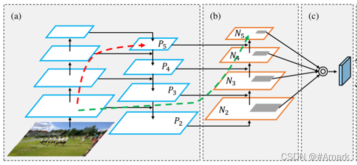 PAN是在FPN的基础上新添加了一条由下至上的路径。FPN即特征金字塔网络,如图三(a)所示,PAN如图三(a)(b)所示